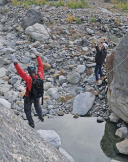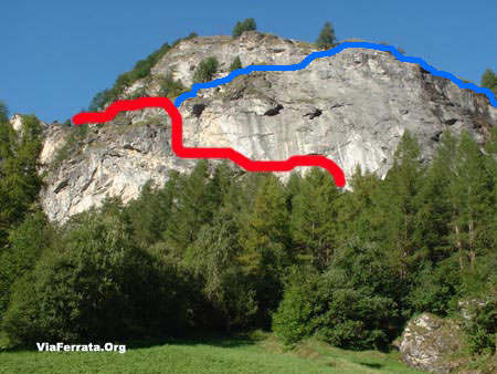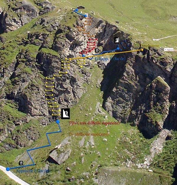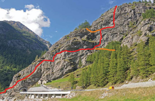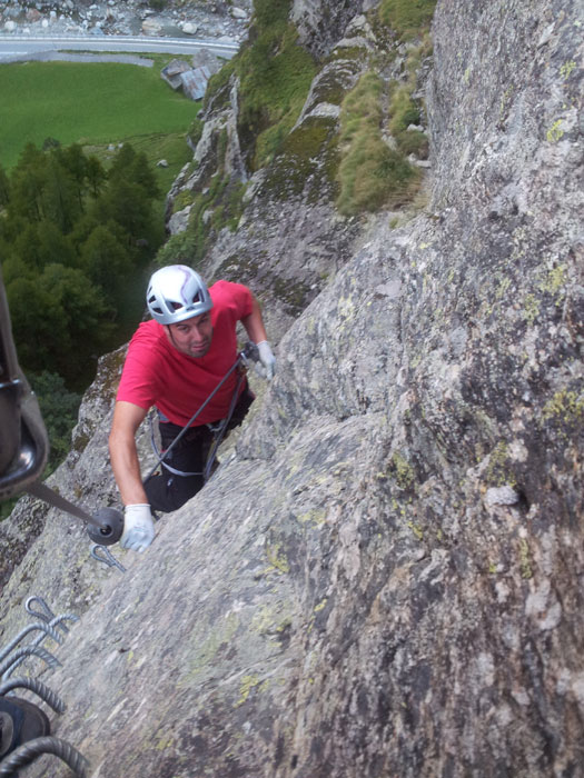 At the top of the first part you have a choice, either you can go to the left to climb the second part,very enjoyable with a breathtaking and turquoise view of the Moiry Lake; or you can continue, cross an easy ledge with a small vertical projection to get to the sixth part, Very Difficult, or take the way out, or go to the foot bridge (it moves and the wood plates are small).
