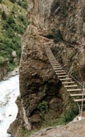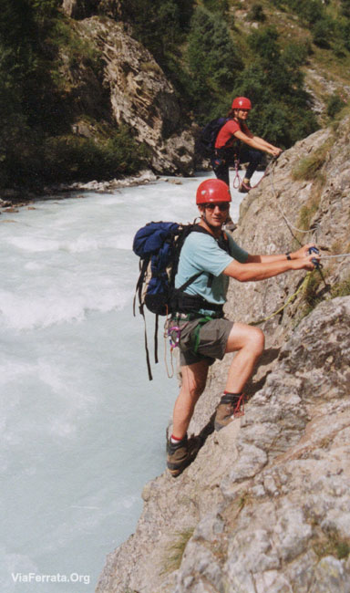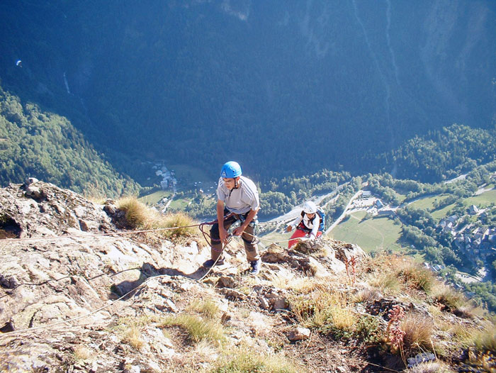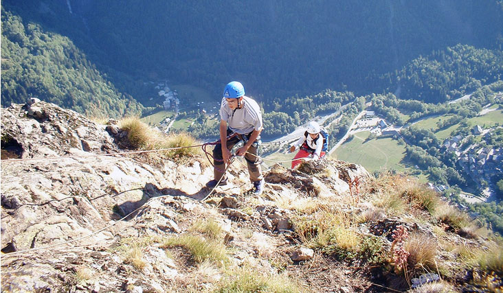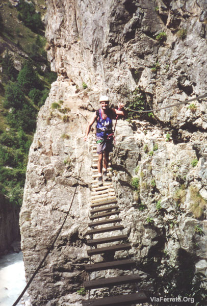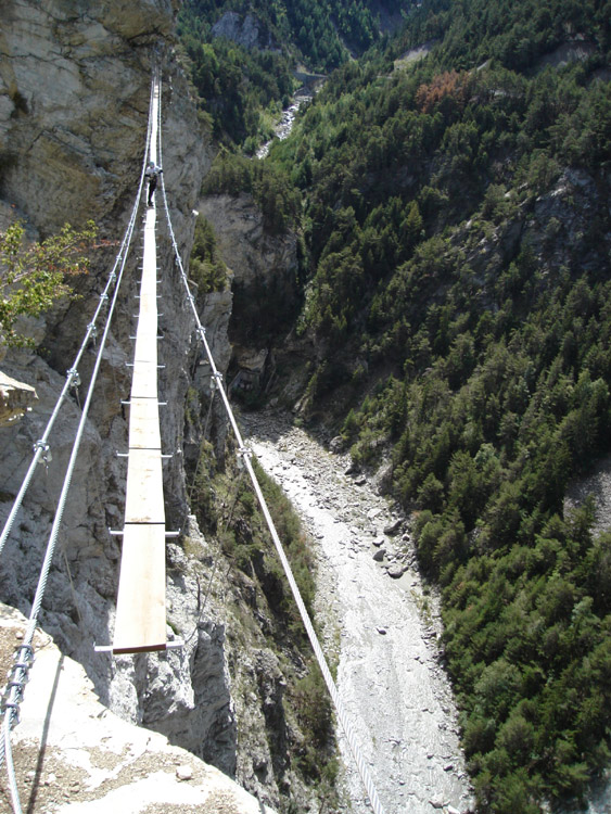 Tu traverses ensuite sur une vire herbeuse jusqu’au pied d’un beau mur à l’équipement obligeant à un bon placement (le mur du bon geste). Des traversées successives, tour à tour rocheuses ou herbeuses, amènent au passage, "émouvant" de l’itinéraire : la passerelle.
