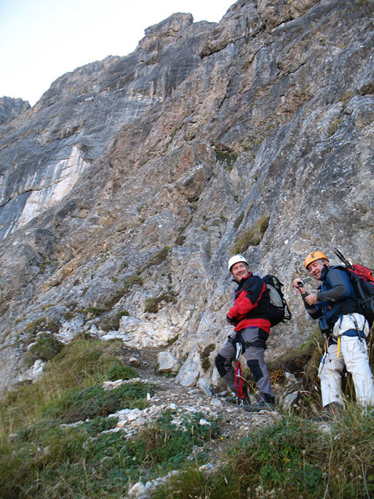 Suit le «bonheur des dames» : une belle combinaison de passages rocheux confortables entre 2 barrières de surplombs; puis la magnifique dalle au lapiaz au cheminement assez naturel, avant la grande traversée des Jardiniers alternant passage sur rocher et sur vires confortables herbeuses.