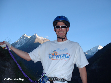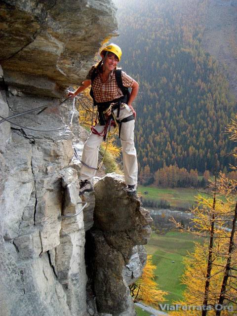 At the top of the first part you have a choice, either you can go to the left to climb the second part,very enjoyable with a breathtaking and turquoise view of the Moiry Lake; or you can continue, cross an easy ledge with a small vertical projection to get to the sixth part, Very Difficult, or take the way out, or go to the foot bridge (it moves and the wood plates are small).