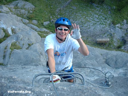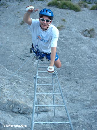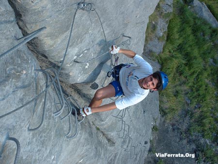 The sixths part is frankly very difficult. You must be in excellent physical condition and your arms need to be strong! This part begins with a 20m overhanging traverse!!! It is extremely tough and not meant for all hands. Once you have passed the overhang, the route continues more calmly for your tired arms, but it is very precipitous and still quite demanding.