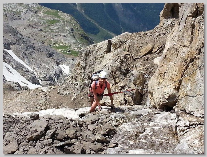 La deuxième partie est un peu plus technique et aérienne. Tu as l’occasion de toucher le rocher et regarde bien où tu mets tes pieds équipés de très bonnes chaussures de marche avec une semelle Vibram. Mais tu sais déjà que la via ne se pratique qu’avec de bonnes chaussures!